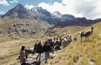 On the way to the first mountain pass, the Abra Warmihua�usca (Dead Woman's Pass), you will see domesticated llamas and alpacas grazing on ichu, one of the few plants that grow at that altitude. You also cross an area of cloud forest, which is the habitat for many different kinds of birds like hummingbirds and sparrows, as well as the Andean or Spectacled bear.